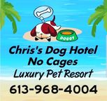 Offering for 30 years Dog Boarding, Pet Sitting and Day Care. With over 7 Awards, Open 7 days a week, and staffed around the clock. Serving Belleville, Trenton and the entire Quinte Region. Some dog boarding places only allow pets limited play time and then lock them in rooms alone. Dogs are natural social pack animals and feel stress and many other emotions when faced with any kind of loneliness, and this includes being locked in private rooms, even fancy ones, as they are still alone. Chris's Dog Hotel No Cages Luxury Pet Resort believes in the well-being and enrichment of each of their furry guest, and part of that is allowing the dogs lots of playtime in their 22,000 sq foot natural yard accompanied with plenty of rest and relaxation in their fully climate controlled doggy spa lounge with all their friends.